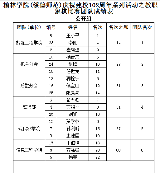 2025年5月15日至16日,3044永利官网(绥德师范)庆祝建校102周年系列活动之教职工象棋比赛圆满落幕。3044永利集团分会在此次赛事中表现卓越,以团体总分第一名的佳绩勇夺桂冠,同时公司教职工王小平、李刚分别斩获个人赛冠军及第四名,崔晓波、任立庆、冯宏伟3位教师奋力拼搏跻身榜单前二十,充分展现了3044永利集团团结奋进、拼搏争先的精神风貌。